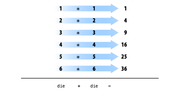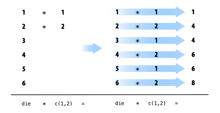 die - 1, R subtracts one from each element ofdie.- When you use two or more vectors in an operation, R will line up the vectors and perform a sequence of individual operations. For example, when you run die * die, R lines up the two die vectors and then multiplies the first element of vector 1 by the first element of vector 2. It then multiplies the second element of vector 1 by the second element of vector 2, and so on, until every element has been multiplied. The result will be a new vector the same length as the first two.
